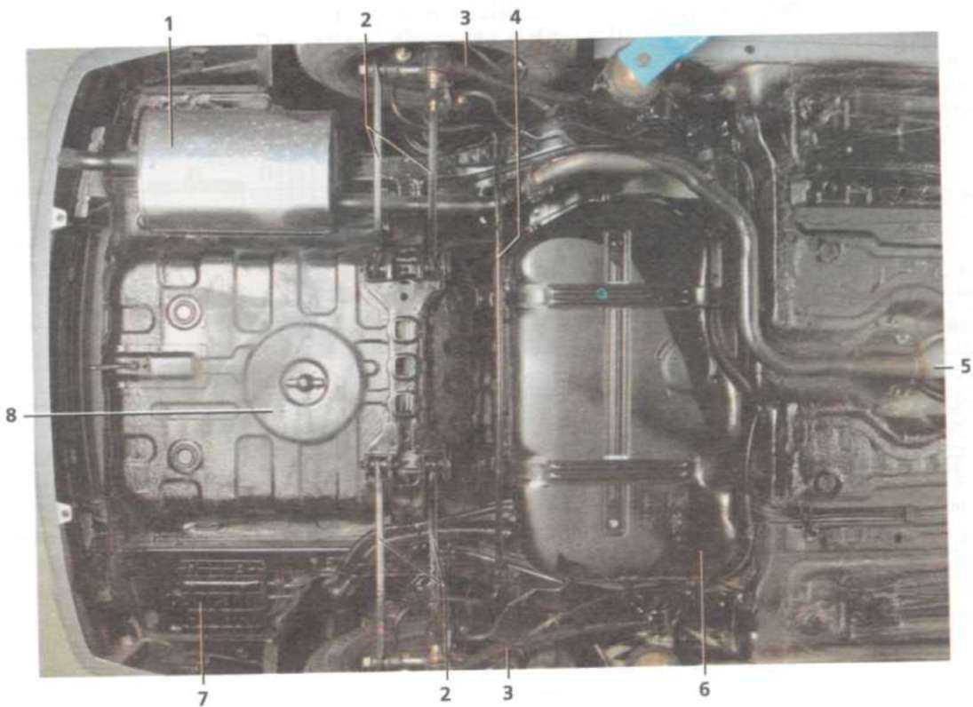 Задняя часть автомобиля (вид снизу): 1 — основной глушитель системы выпуска отработавших газов; 2 — поперечные рычаги; 3 — продольный рычаг; 4 — штанга стабилизатора поперечной устойчивости; 5 — дополнительный глушитель системы выпуска отработавших газов; б — топливный бак; 7 — адсорбер системы улавливания паров топлива; 8 — ниша под запасное колесо