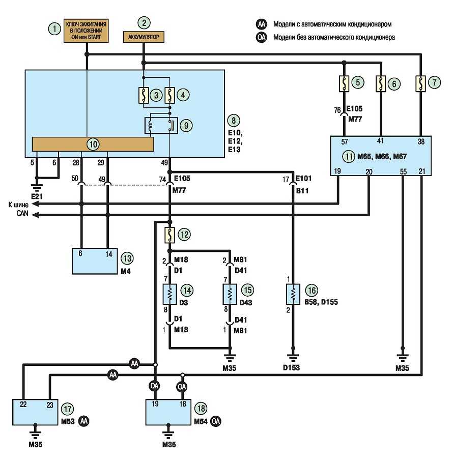 Схема 30. Система управления обогревом стекла двери задка: 1 — замок зажигания; 2 — аккумуляторная батарея; 3,4,5, 6, 7,12 — предохранители; 8- монтажный блок предохранителей в моторном отсеке; 9 — реле обогревателя заднего стекла; 10 — процессор монтажного блока; 11 — блок управления электрооборудованием кузова; 13 — разъем для передачи данных; 14 — обогреватель наружного зеркала заднего вида со стороны водителя; 15 — обогреватель наружного зеркала заднего вида со стороны пассажира; 16 — обогреватель окна двери задка; 17 — автоматический регулятор обогрева окна двери задка; 18 — панель управления отопителем