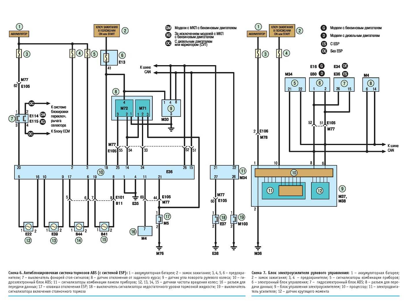 Схема 7. Блок электроусилителя рулевого управления: 1 — аккумуляторная батарея; 2 — замок зажигания; 3, 4 — предохранители; 5 — сигнализаторы комбинации приборов; 6 — электронный блок управления; 7 — гидроэлектронный блок ABS; 8 — разъем для передачи данных; 9 — блок управления электроусилителем; 10 — процессор; И — электродвигатель усилителя; 12 — датчик крутящего момента