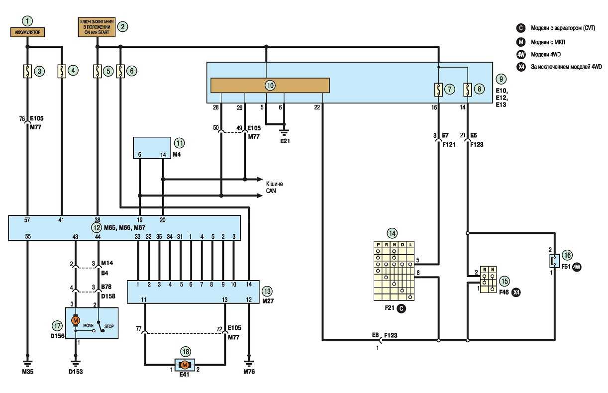 Схема 29. Стеклоочиститель окна двери задка: 1 — аккумуляторная батарея; 2 — замок зажигания; 3,4,5, б, 7,8 — предохранители; 9 — монтажный блок предохранителей в моторном отсеке; 10 — процессор монтажного блока; 11 — разъем для передачи данных; 12 — блок управления электрооборудованием кузова; 13 — подрулевой переключатель наружного освещения; 14 — селектор выбора передач (вариатор); 15 — выключатель положения парковка-нейтраль; 16 — выключатель фонарей света заднего хода; 17 — моторедуктор стеклоочистителя окна двери задка; 18 — насос омывателя окна двери задка