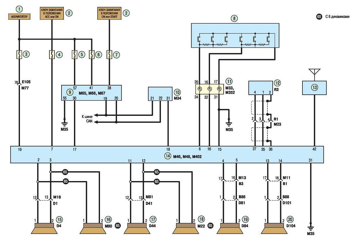 Схема 32. Аудиосистема (без навигационной системы): 1 — аккумуляторная батарея; 2 — замок зажигания; 3,4, 5, б, 7 — предохранители; 8 — блок управления аудиосистемой на рулевом колесе; 9 — монтажный блок предохранителей, расположенный в моторном отсеке; 10 — комбинация приборов; 11 — блок держателя подрулевых переключателей и токоведущей шины; 12 — микрофон системы hands free; 13 — антенна на крыше; 14 — головное устройство аудиосистемы; 15 — динамик в левой передней двери; 16 — левый высокочастотный динамик; 17 — динамик в правой передней двери; 18 — правый высокочастотный динамик;19 — динамик в левой задней двери; 20 — динамик в правой задней двери