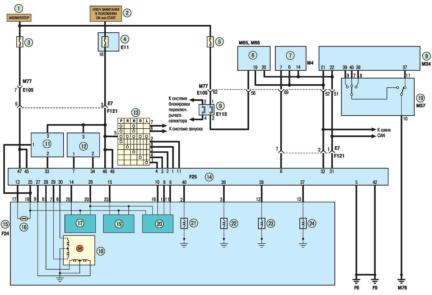 Схема 3. Система управления трансмиссией с вариатором CVT: 1 — аккумуляторная батарея; 2 — замок зажигания; 3,4, 5 — предохранители; 6 — блок управления электрооборудованием кузова; 7 — разъем для передачи данных; 8 — сигнализатор комбинации приборов; 9 — выключатель фонарей стоп-сигнала; 10 — селектор выбора передач; 11 — датчик оборотов ведущего шкива; 12 — датчик оборотов ведомого шкива; 13 — выключатель положения нейтраль-парковка; 14- электронный блок управления двигателем; 15 — блок вариатора; 16 — датчик температуры рабочей жидкости вариатора; 17 — датчик давления на ведущем шкиве; 18 — шаговый двигатель; 19 — датчик давления на ведомом шкиве; 20 — ПЗУ в сборе; 21 — электроклапан давления основной магистрали; 22 — электроклапан давления, подводимого к ведомому шкиву; 23 — электроклапан муфты гидротрансформатора; 24 — электроклапан выбора блокировки