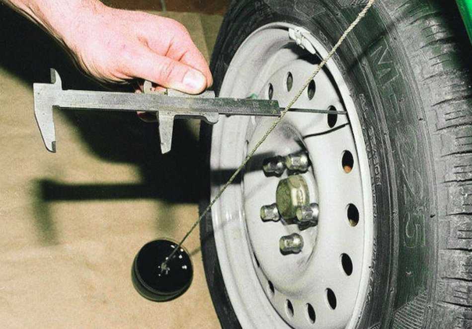 . Развал: Для этого берём отвес, на конце гайка, к примеру, и прикладываем к заднему колесу посередине, снизу берём ориентир заподлицо с частью колеса или литья, а сверху смотрим какой зазор получился.