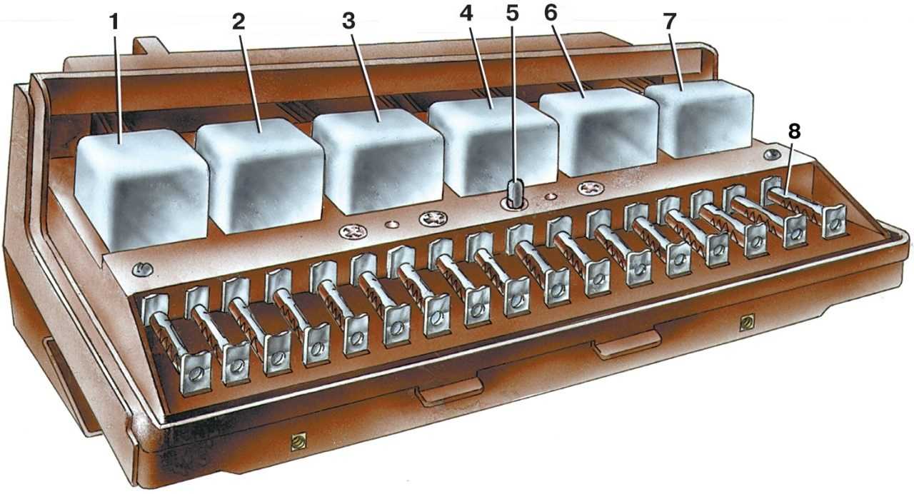 Рис. 8—1. Монтажный блок (крышка снята): 1 — реле включения обогрева заднего стекла (Р1); 2 — реле включения очистителей и омывателя фар (Р2); 3 — реле включения звуковых сигналов (Р3); 4 — реле включения электродвигателя вентилятора системы охлаждения двигателя (Р4); 5 — запасной предохранитель; 6 — реле включения дальнего света фар (Р5); 7 — реле включения ближнего света фар (Р6); 8 — предохранитель |