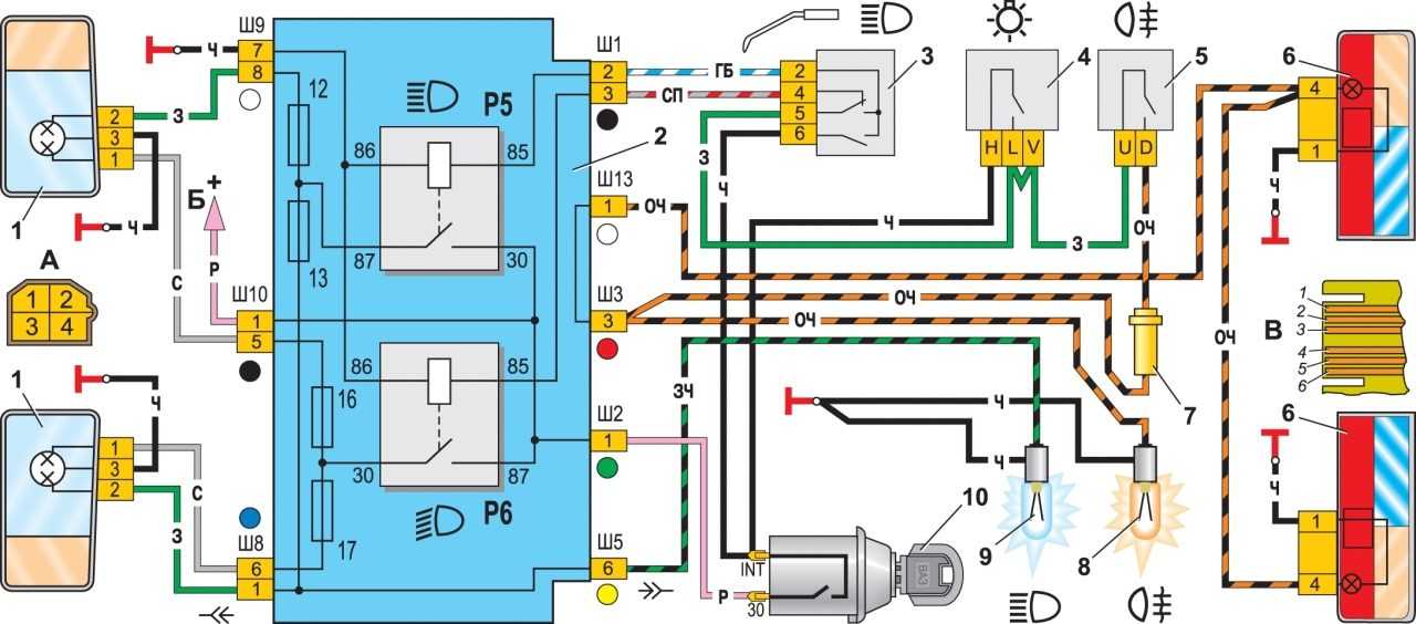 Рис. 8–31. Схема включения фар и противотуманного света в задних фонарях: 1 — блок-фары; 2 — монтажный блок; 3 — переключатель света фар в трехрычажном переключателе; 4 — переключатель наружного освещения; 5 — выключатель заднего противотуманного света; 6 — задние фонари; 7 — предохранитель цепи заднего противотуманного света; 8 — контрольная лампа противотуманного света, расположенная в блоке контрольных ламп; 9 — контрольная лампа дальнего света фар, расположенная в спидометре; 10 — выключатель зажигания; Р5 — реле включения дальнего света фар; Р6 — реле включения ближнего света фар. А — вид на штекерный разъем блок-фары: 1 — штекер ближнего света; 2 — штекер дальнего света; 3 — штекер массы; 4 — штекер габаритного света; Б — к клемме «30» генератора. В – выводы печатной платы заднего фонаря (нумерация выводов от края платы): 1 — на массу; 2 — к лампе стоп-сигнала; 3 — к лампе габаритного света; 4 — к лампе противотуманного света; 5 — к лампе света заднего хода; 6 — к лампе указателя поворота |