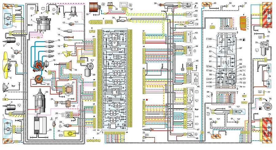 1 – блок-фара; 2 – моторедуктор очистителя фары*; 3 – выключатель подкапотной лампы; 4 – звуковой сигнал; 5 – электродвигатель вентилятора системы охлаждения двигателя; 6 – датчик включения электродвигателя вентилятора; 7 – генератор; 8 – электромагнитный клапан включения омыва фар*; 9 – электромагнитный клапан включения омыва заднего стекла* (на ВАЗ-21099 не устанавливается); 10 – электромагнитный клапан включения омыва ветрового стекла; 11 – электродвигатель омывателя стекол; 12 – датчик контрольной лампы давления масла; 13 – электромагнитный клапан карбюратора; 14 – концевой выключатель карбюратора; 15 – свечи зажигания; 16 – штепсельная розетка для переносной лампы; 17 – подкапотная лампа; 18 – датчик-распределитель зажигания; 19 – блок управления электромагнитным клапаном карбюратора; 20 – моторедуктор очистителя ветрового стекла; 21 – коммутатор; 22 – катушка зажигания; 23 – стартер; 24 – датчик верхней мертвой точки 1-го цилиндра**; 25 – колодка диагностики**; 26 – реле включения стартера; 27 – датчик указателя температуры охлаждающей жидкости; 28 – выключатель света заднего хода; 29 – аккумуляторная батарея; 30 – датчик уровня тормозной жидкости; 31 – монтажный блок; 32 – выключатель контрольной лампы стояночного тормоза; 33 – выключатель стоп-сигнала; 34 – лампа освещения вещевого ящика; 35 – электродвигатель вентилятора отопителя; 36 – дополнительный резистор электродвигателя отопителя; 37 – переключатель вентилятора отопителя; 38 – лампа подсветки рычагов отопителя; 39 – прикуриватель; 40 – выключатель обогрева заднего стекла; 41 – выключатель заднего противотуманного света; 42 – предохранитель цепи противотуманного света; 43 – выключатель аварийной сигнализации; 44 – выключатель наружного освещения; 45 – реле зажигания; 46 – выключатель зажигания; 47 – подрулевой переключатель; 48 – выключатель освещения приборов; 49 – боковой указатель поворота; 50 – выключатель плафона на стойке передней двери; 51 – выключатель плафона на стойке задней двери (на ВАЗ-2108 и ВАЗ-21083 – не устанавливались); 52 – плафон; 53 – колодки для подключения к плафону индивидуального освещения салона; 54 – выключатель контрольной лампы воздушной заслонки карбюратора; 55 – контрольная лампа указателей поворота; 56 – контрольная лампа наружного освещения; 57 – контрольная лампа заднего противотуманного света; 58 – резервная контрольная лампа; 59 – контрольная лампа дальнего света фар; 60 – контрольная лампа обогрева заднего стекла; 61 – спидометр; 62 – комбинация приборов; 63 – лампы освещения комбинации приборов; 64 – указатель температуры охлаждающей жидкости; 65 – вольтметр; 66 – указатель уровня топлива с контрольной лампой резерва; 67 – эконометр; 68 – лампа табло «STOP»; 69 – контрольная лампа заряда аккумуляторной батареи; 70 – контрольная лампа воздушной заслонки карбюратора; 71 – контрольная лампа аварийной сигнализации; 72 – контрольная лампа уровня тормозной жидкости; 73 – контрольная лампа стояночного тормоза; 74 – контрольная лампа давления масла; 75 – задний фонарь; 76 – датчик указателя уровня и резерва топлива; 77 – колодки для подключения к элементу обогрева заднего стекла; 78 – фонари освещения номерного знака; 79 – моторедуктор очистителя заднего стекла* (на ВАЗ-21099 не устанавливались)