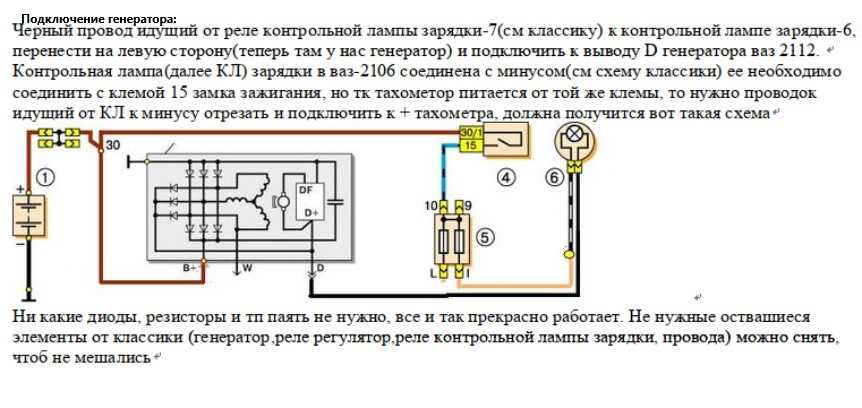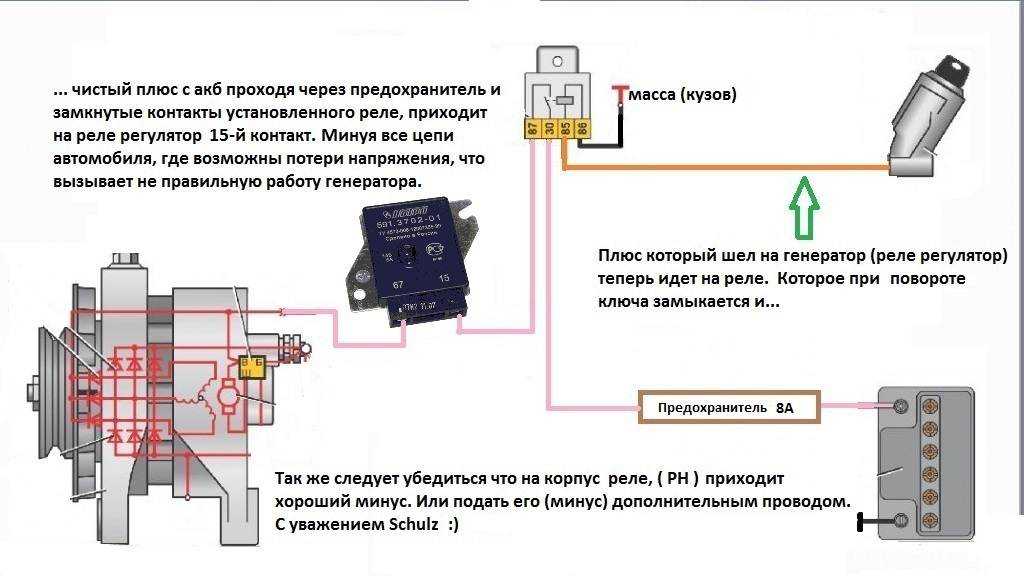 На нижнем фото видим схему, которая показывает подключение уже встроенного реле регулятора.