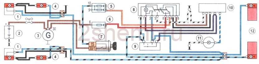 1 — световые устройства поворотных огней, установленные в передних оптических приборах; 2 — АКБ VAZ-2106; 3 — генераторный узел авто; 4 — боковые поворотные огни, расположенные на передних крыльях; 5 — главный монтажный модуль с предохранительными элементами; 6 — вспомогательный управляющий блок с предохранительными устройствами; 7 — замок зажигания; 8 — устройство для отключения и активации световой сигналки, монтируется в салоне машины на центральной консоли; 9 — переключательное устройство для активации и отключения поворотных огней; 10 — прерывательное устройство, использующееся для мигания поворотных огней и световой сигналки; 11 — спидометр, оснащенный контрольным световым индикатором активации поворотных огней; 12 — световые устройства указателей поворотных огней в задней оптике.