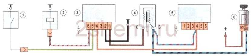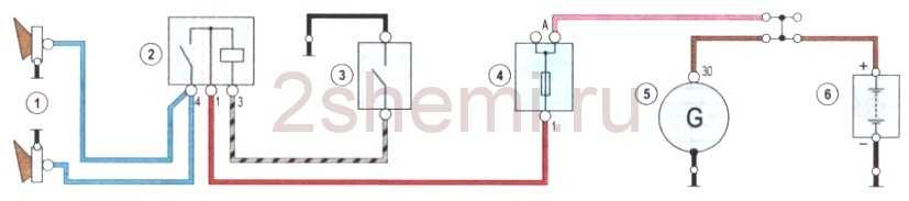 1 — звуковые устройства, использующиеся для воспроизведения импульсов; 2 — реле активации звуковых импульсов, защищает электроцепь от перенапряжения; 3 — переключатель звуковых импульсов; 4 — монтажный модуль с предохранительными элементами; 5 — генераторная установка ВАЗ 2106; 6 — АКБ.