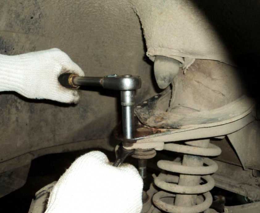 Для демонтажа верхнего рычага используют те же инструменты, что и для нижнего, и проводят аналогичные действия по вывешиванию передка транспортного средства и снятию колеса. Затем выполняют следующие шаги: