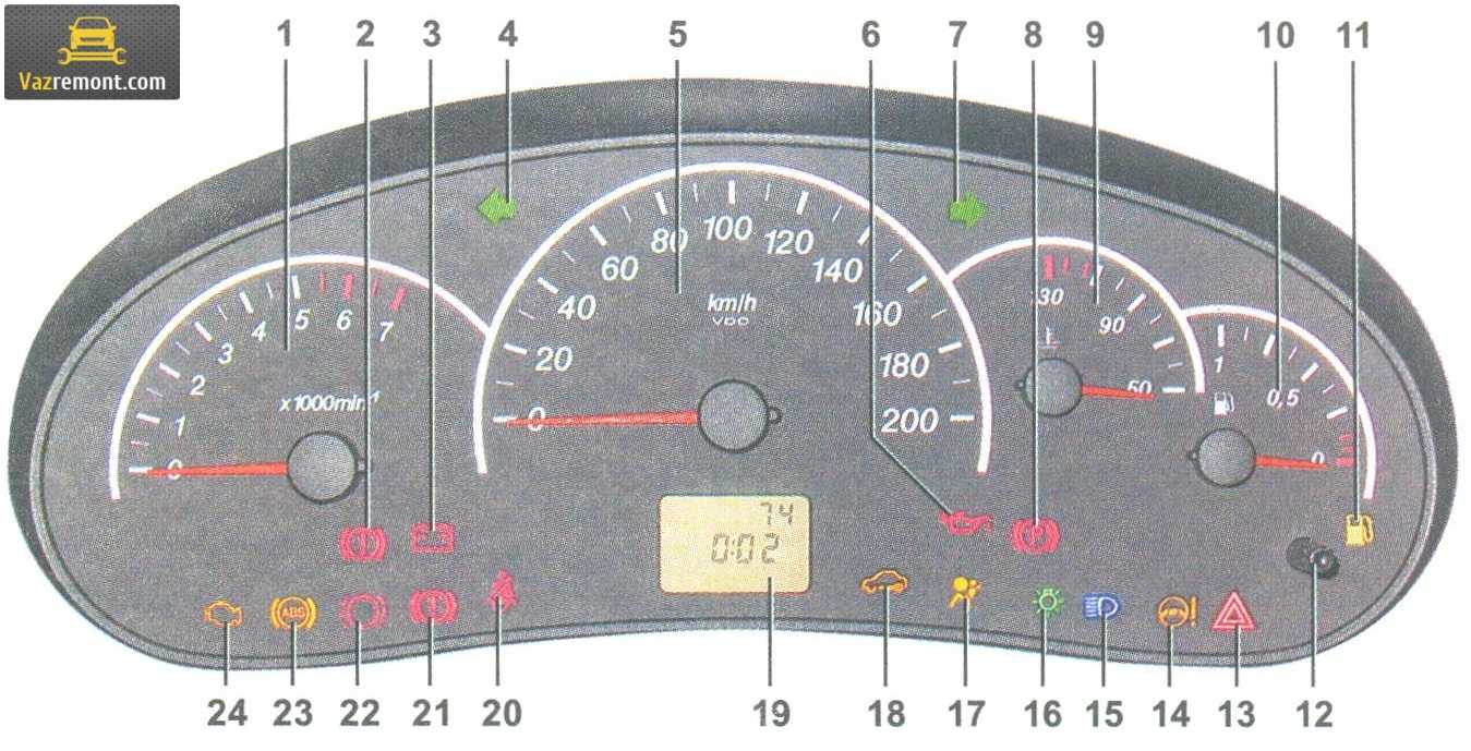 | 1 | Тахометр. Прибор измеряет частоту коленвала двигателя (обороты в минуту). Если стрелка заходит за красное значение, значит – мотор Лада Приора работает в опасном режиме; |