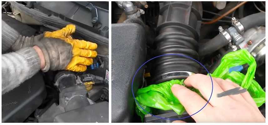 – открутить воздухоподводящий патрубок вместе с датчиком от корпуса воздушного фильтра и запустить двигатель. Затем прикрыть рукой узел с датчиком и смотреть на реакцию — если все в норме, то мотор должен заглохнуть, сильно сжав патрубок после датчика воздуха. В противном случае этого не произойдет и скорее всего можно будет услышать шипение. Если не удается найти подсос воздуха таким методом, то тогда нужно продолжить поиски уже другими доступными способами.