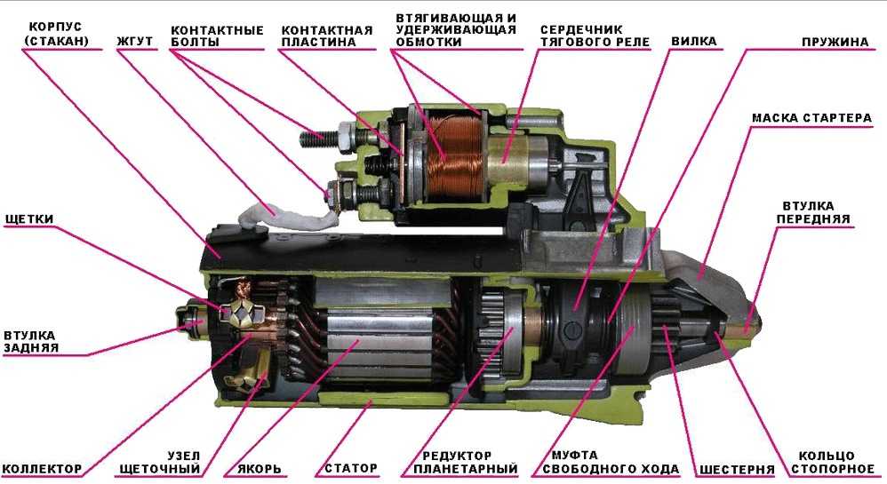 Одна из основных частей любого стартера – это втягивающее реле, которое расположено рядом с ним. Этот механизм выполняет сразу две функции: