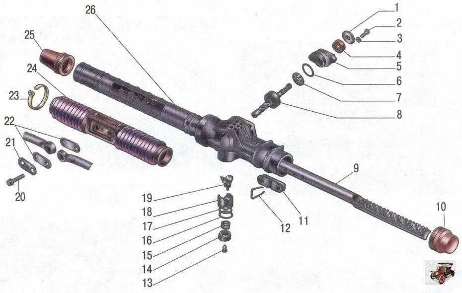 Конструкция рулевой рейки: 1 – пыльника вала, 2 — болты крепления крышки, 3 — тарельчатая шайба, 4 – сальник червячного вала, 5 – крышка червячного механизма, 6 – манжета уплотнительная, 7 – упорный подшипник, 8 – вал червяка с подшипником, 9 – рашпиль, 10 – левый пыльник, 11 –бинокль, 12 – скоба бинокля, 13 – заглушка гайки, 14 – упорная гайка подтяжки, 15 – упорная пружина, 16 – стопорная манжета, 17 — манжета упорного поршня, 18 — упорный поршень рашпиля, 19 – вкладыш поршня, 20 — болт рулевых тяг, 21 – стопор, 22 – пластина, 23 – пластиковый хомут, 24 – пыльник рулевой рейки, 25 – левый боковой пыльник, 26 – труба рулевой рейки.
