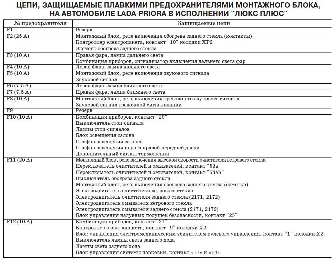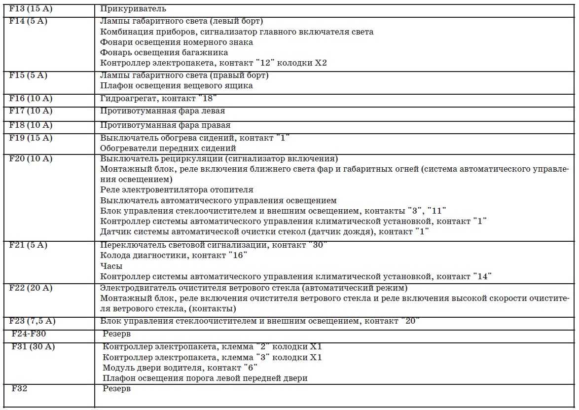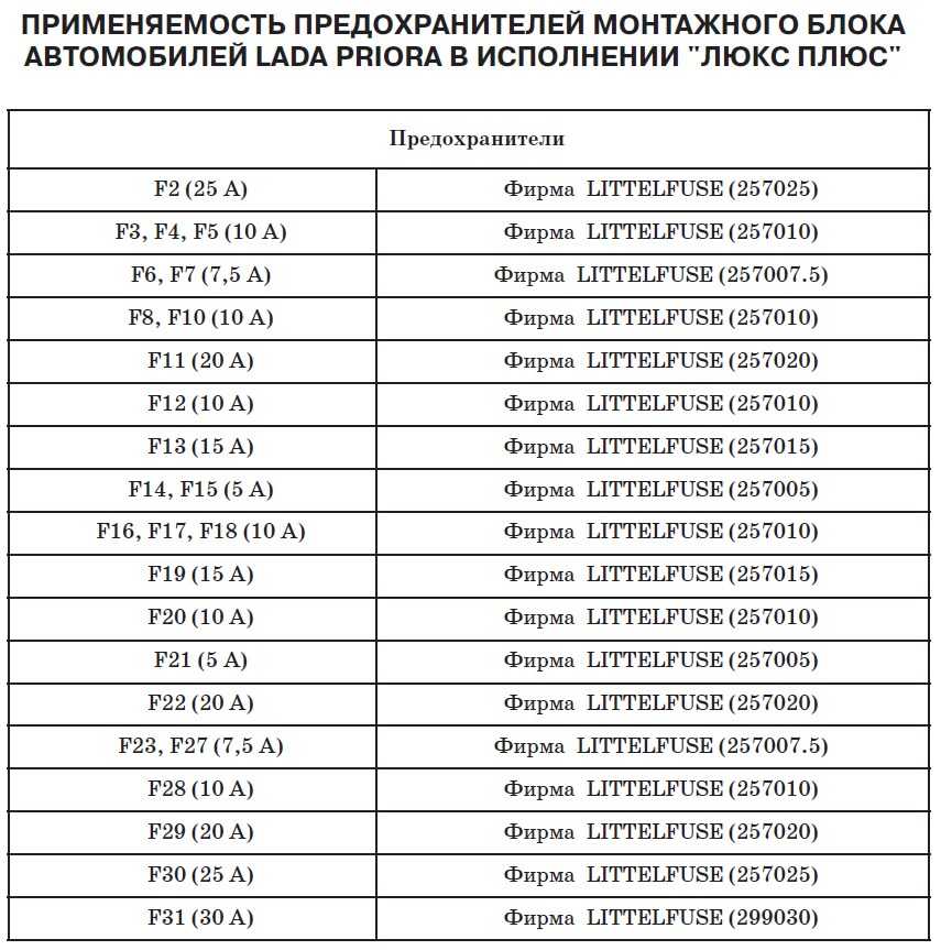 F1 25 Электровентилятор радиатора системы охлаждения F2 25 Обогрев заднего стекла Приоры F3 10 Дальний свет правый F4 10 Дальний свет левый F5 10 Звуковой сигнал F6 7.5 Ближний свет (левый) F7 7.5 Ближний свет (правый) F8 10 Тревожный сигнал F9 25 Отопитель Приоры F10) 7.5 Освещение салона, комбинация приборов, стоп-сигнал F11 20 Стеклоочиститель F12 10 Клемма 15 приборов F13 15 Прикуриватель F14 5 Габаритный огонь левый, освещение номерного знака, освещение багажника F15 5 Габаритный огонь правый F16 10 Клемма 15 АБС F17 10 Противотуманная фара (ПТФ) левая F18 10 Противотуманная фара (ПТФ) правая F19 15 Обогрев сидений F31 или F27 30 Блок управления электропакетом