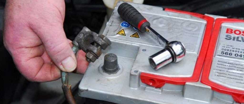 В начале ремонта необходимо обесточить электросистему автомобиля – снимаем клеммы с аккумулятора (обычно минусовую клемму).