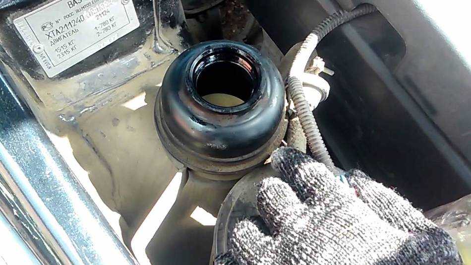 Извлеките щуп из контрольного отверстия КПП Приоры Открутите крышку и слейте отработанное масло из коробки Залейте свежую смазку в агрегат, контролируя ее объем по уровню щупа