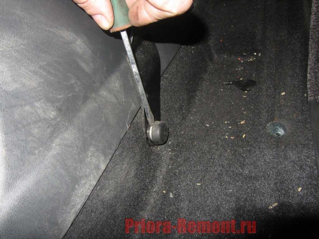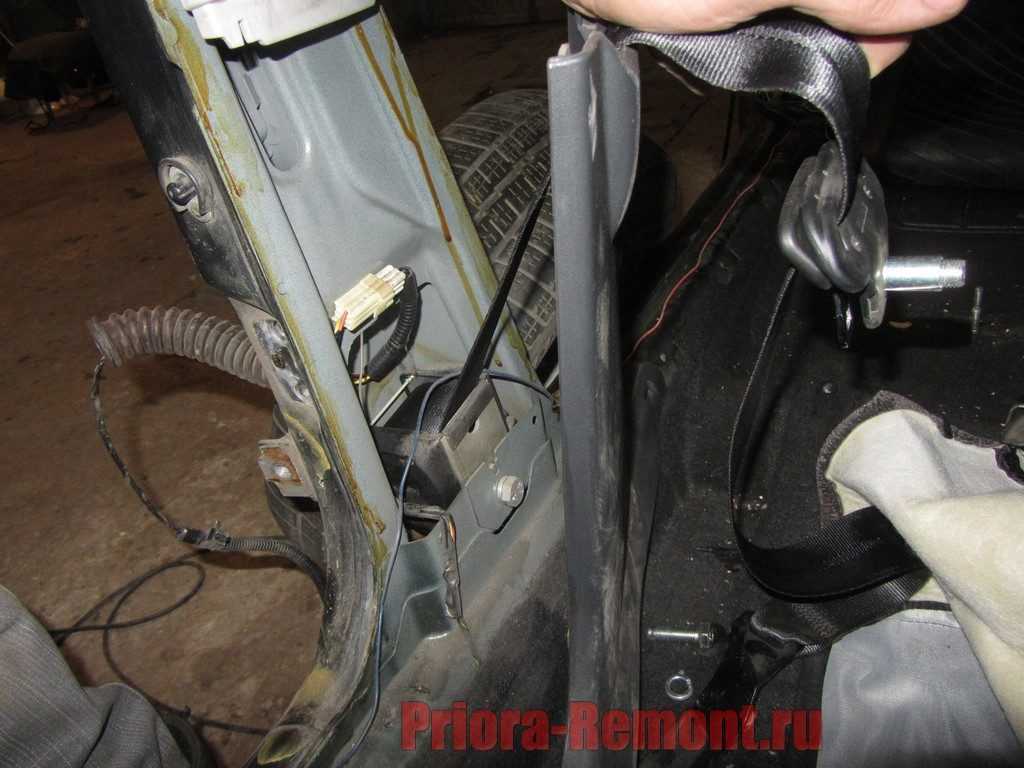 Теперь откручиваем и отводим в сторону накладку центральной стойки в салоне, и под ней снизу увидим инерционный механизм ремня безопасности Приоры.