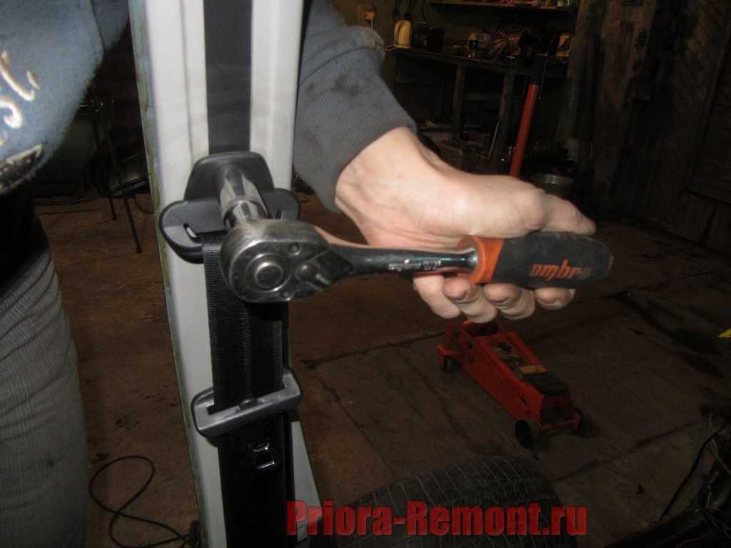 2. Ключом «на 17» выверните болт верхнего крепления ремня…
