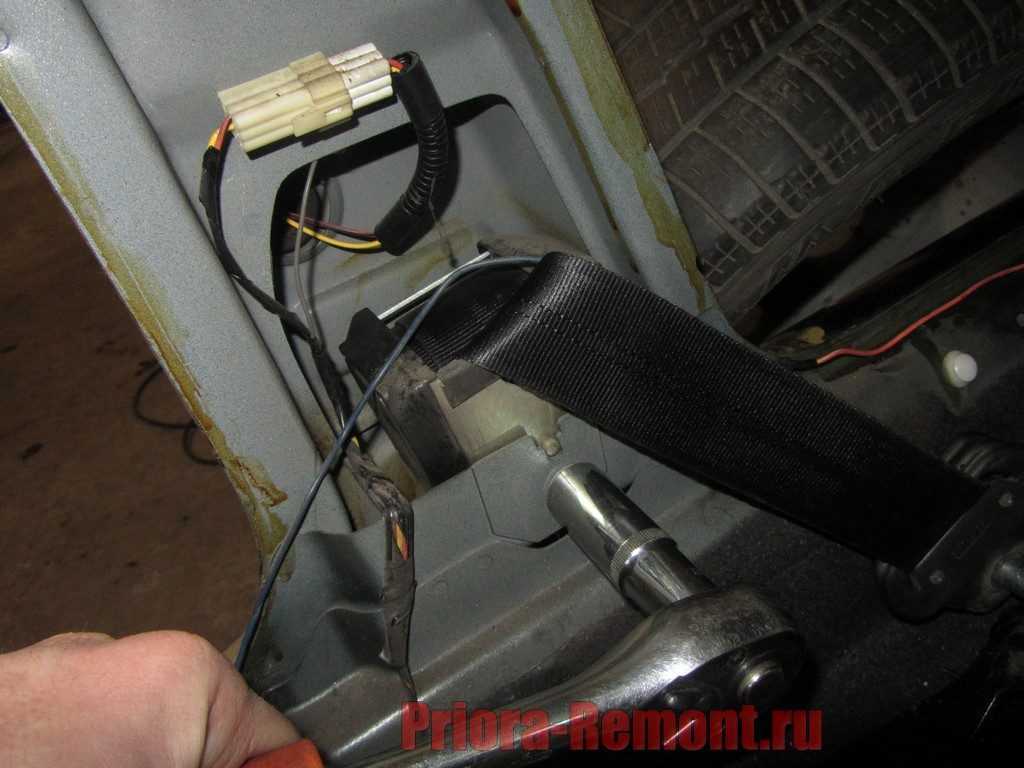 Теперь можно снимать ремень полностью, так как больше его ничего не держит. Установка новых ремней безопасности на Приору происходит в обратной последовательности. При замене стоит иметь ввиду, что инерционный механизм работает только в определенном положении самой катушки. То есть, если вы немного наклонили или изменили угол катушки, то размотать ремень у вас не получится.